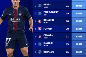 体育资讯10月11日讯 德国转会市场更新了法甲球员最新身价情况,在U21球员中,杜埃和若昂-内维斯以9000万欧并列榜首,排名前10的球员中有5名都来自巴黎圣日耳曼。
